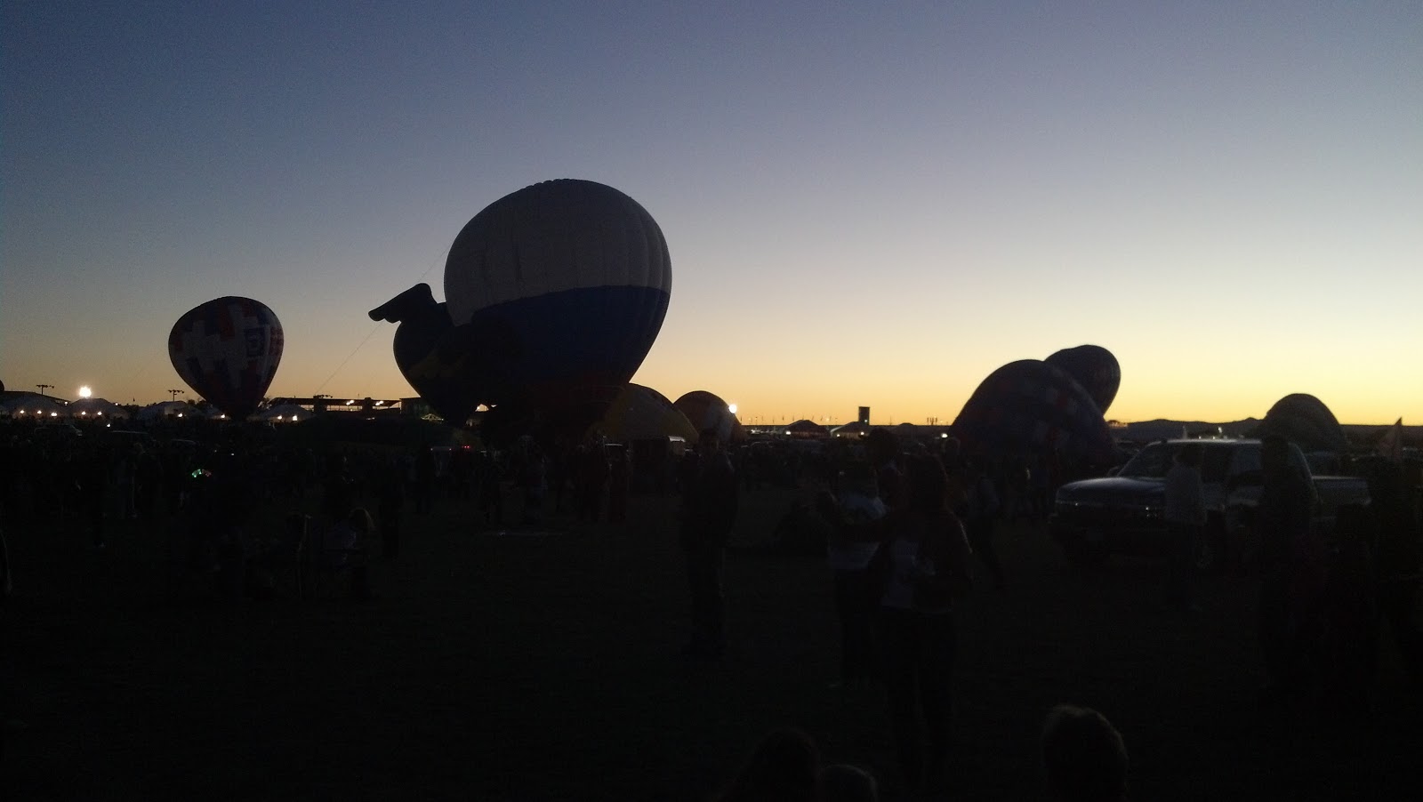 Yesterday I was lucky enough to be able to go to the evening events for the 41st annual Albuquerque International Balloon Fiesta (and Chainsaw Carving Invitational). UNM had a trip for students on campus during fall break so naturally I jumped at the chance to go for only $4. It was a long bus ride out to the fairgrounds, which are up in Rio Rancho, sort of a suburb of ABQ but still part of it. I was struck by just how open the sky was when we got there: